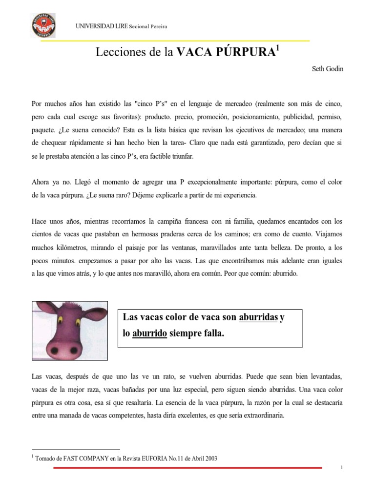 Text of la vaca púrpura. Aug 27, 2015·1 min read. Es algo increíble, emocionante, diferente, algo que nunca se olvida. Resumen del libro la vaca púrpura de seth godin. 110 páginas · 2015 · 1.07 mb · 37,980 descargas· español.